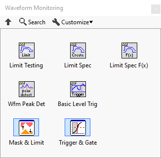 ! style="text-align: center;" | [[File:Waveform Monitoring Palette - Ex_Inst_Trigger and Gate.png|frameless|border| | ! style="text-align: center;" | [[File:Waveform Monitoring Palette - Ex_Inst_Trigger and Gate.png|frameless|border|Trigger and Gate Express VI|link=Trigger and Gate Express VI]] | ||