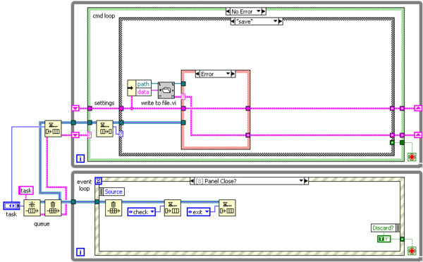 The “event loop” (bottom) produces enumerated commands that are processed by the “cmd loop” (top). The outer case structure in the top loop traps for errors that are placed on the lower shift register. The corresponding error case (not shown) allows error handling by “code” with different methods of notification. For example, a user interface application based on this design pattern might employ the General Error Handler.vi shown in Figure 3 to display a dialog for particular errors. However, this method would not work for applications that run continuously without user interaction.