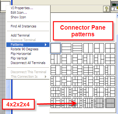 The 4x2x2x4 pattern highlighted above is the most commonly used for NI primitives. In LabView 8 and above the connector pane is defaulted to the 4x2x2x4 pattern.