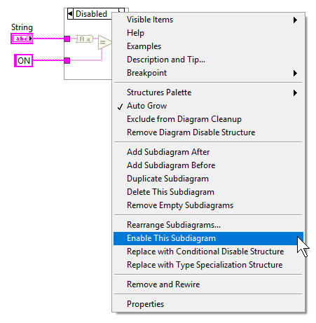 Illustrates how to enable the currently selected subdiagram in a Diagram Disable structure